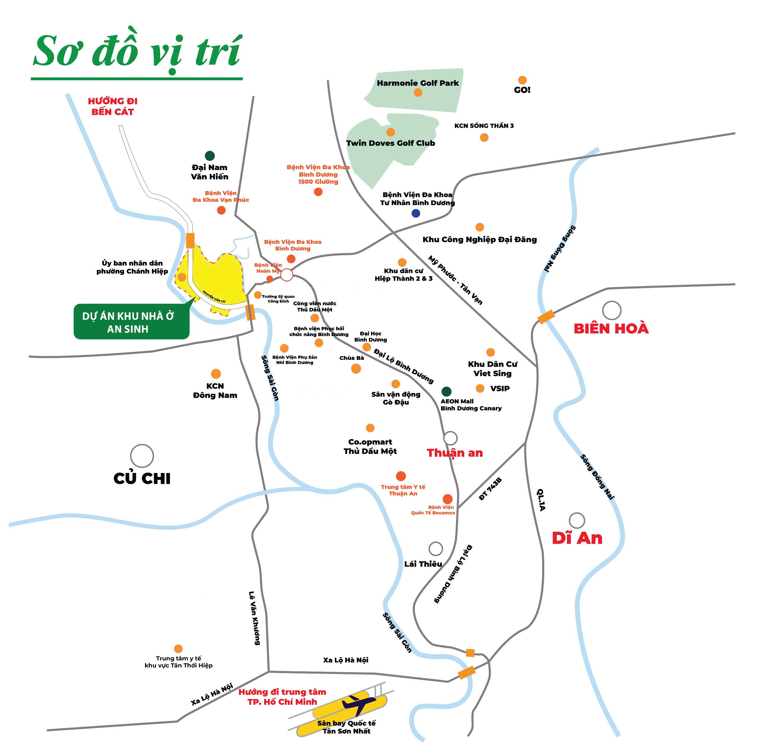 Khu nhà ở An Sinh thuộc Khu đô thị sinh thái Chánh Mỹ, phường Chánh Mỹ, thành phố Thủ Dầu Một, tỉnh Bình Dương. Với view sông Sài Gòn thoáng đãng, dự án mang lại không gian sống trong lành và yên bình.